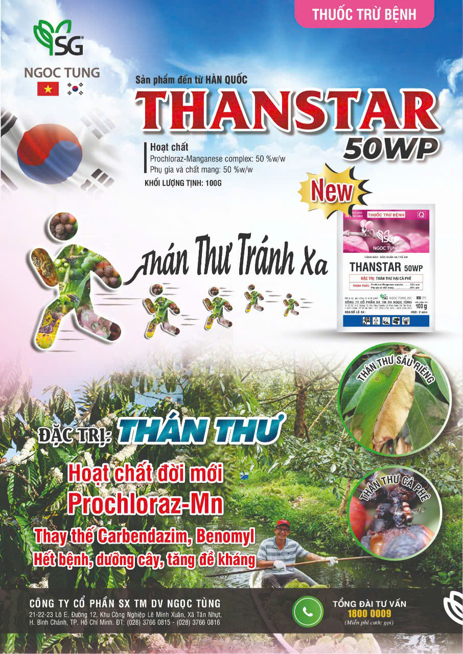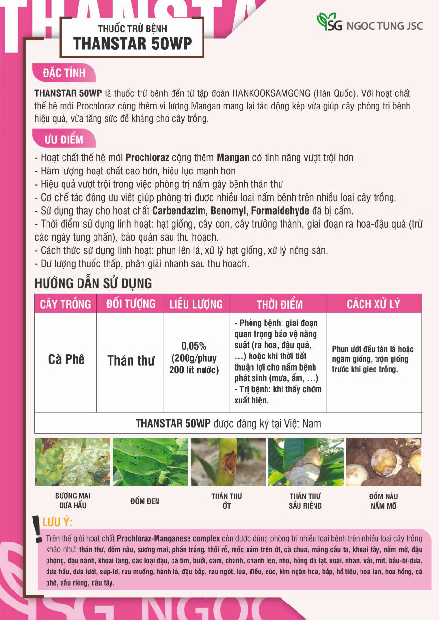 - THANSTAR 50WP là thuốc trừ bệnh đến từ tập đoàn HANKOOKSAMGONG (Hàn Quốc). Với hoạt chất thế hệ mới Prochloraz cộng thêm vi lượng Mangan mang lại tác động kép vừa giúp cây phòng trị bệnh hiệu quả, vừa tăng sức đề kháng cho cây trồng.